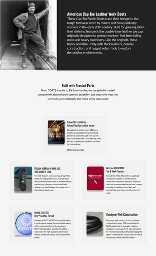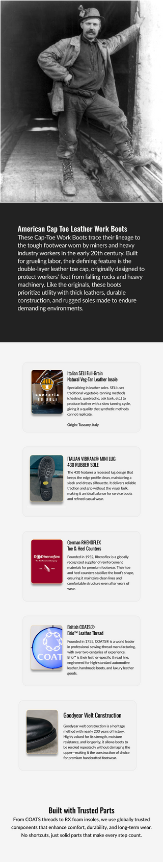 Our boots use Goodyear welt construction, known for its strength, water resistance, and easy resoling. This method lets you replace the sole without damaging the upper, making the boots truly long-lasting. Made to be worn hard, repaired easily, and kept for years — all at a price that stays fair.