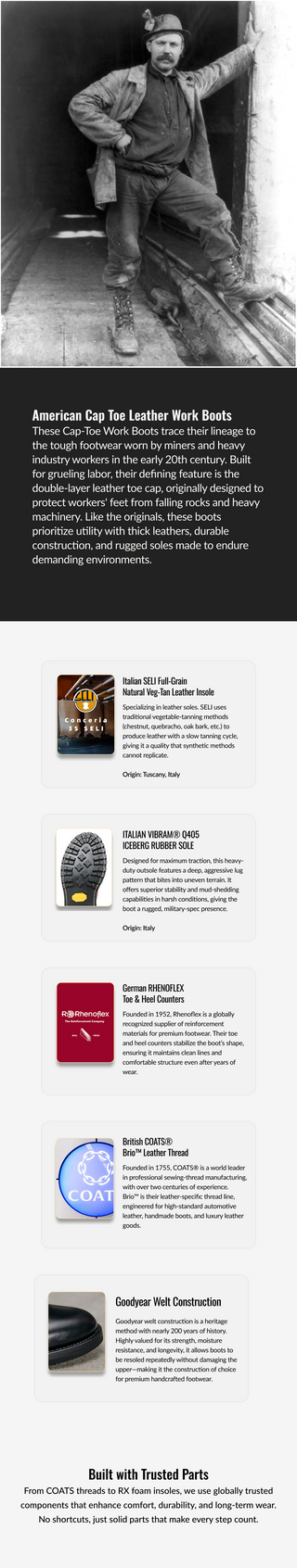Heritage American cap toe work boots crafted from custom dark brown oil-waxed cowhide by TYCHE®, designed with a reinforced leather toe cap and 1950s vintage lasts to capture true Americana workwear spirit. Built with Goodyear welt construction and paired with Italian Vibram® soles for durability, comfort, and enduring style.