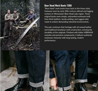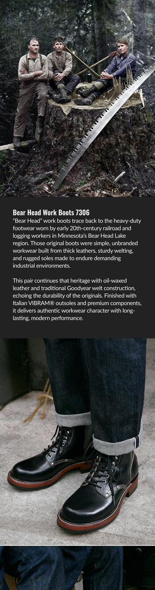 Inspired by early 20th-century railroad boots in Minnesota’s Bear Head Lake region, this pair is crafted from TYCHE® oil-waxed leather and built with Goodyear welt construction. Finished with Italian VIBRAM® soles and premium components, it blends true workwear heritage with long-lasting performance.
