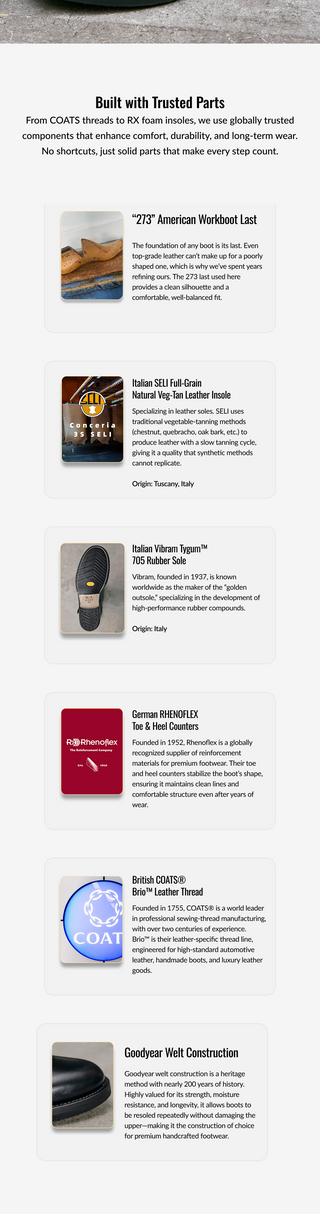 Our boots use Goodyear welt construction, known for its strength, water resistance, and easy resoling. This method lets you replace the sole without damaging the upper, making the boots truly long-lasting. Made to be worn hard, repaired easily, and kept for years — all at a price that stays fair.