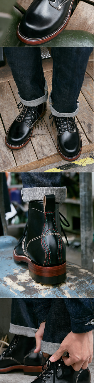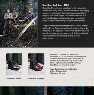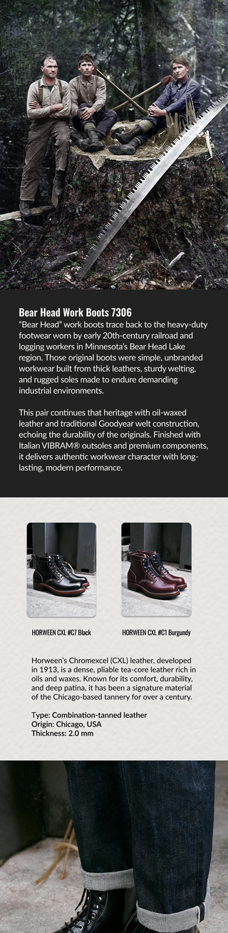 Inspired by early 20th-century railroad boots in Minnesota’s Bear Head Lake region, this pair is crafted from Horween Chromexcel leather and built with Goodyear welt construction. Finished with Italian VIBRAM® soles and premium components, it blends true workwear heritage with long-lasting performance.