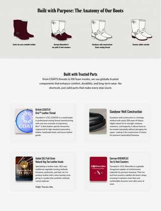 Our boots use Goodyear welt construction, known for its strength, water resistance, and easy resoling. This method lets you replace the sole without damaging the upper, making the boots truly long-lasting. Made to be worn hard, repaired easily, and kept for years — all at a price that stays fair.