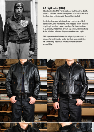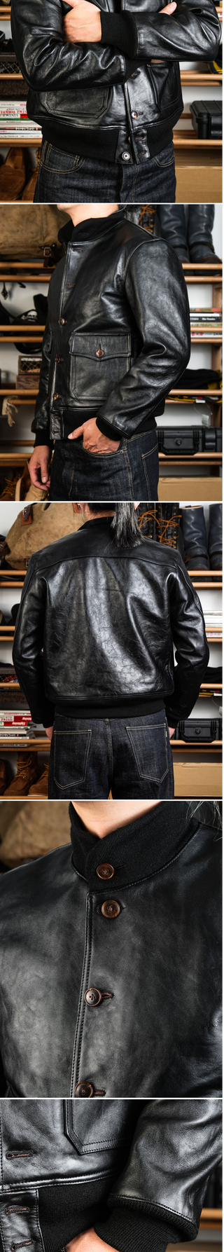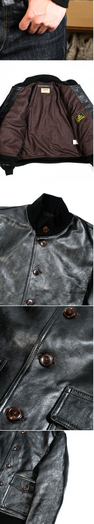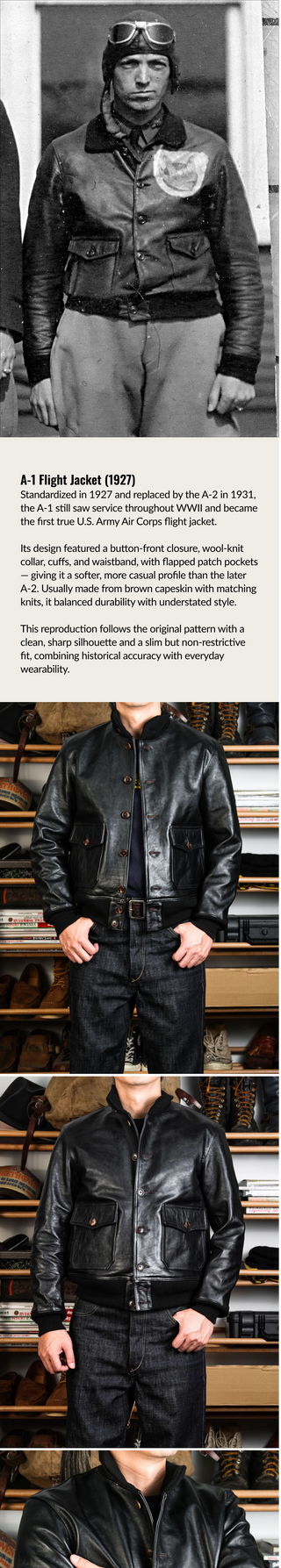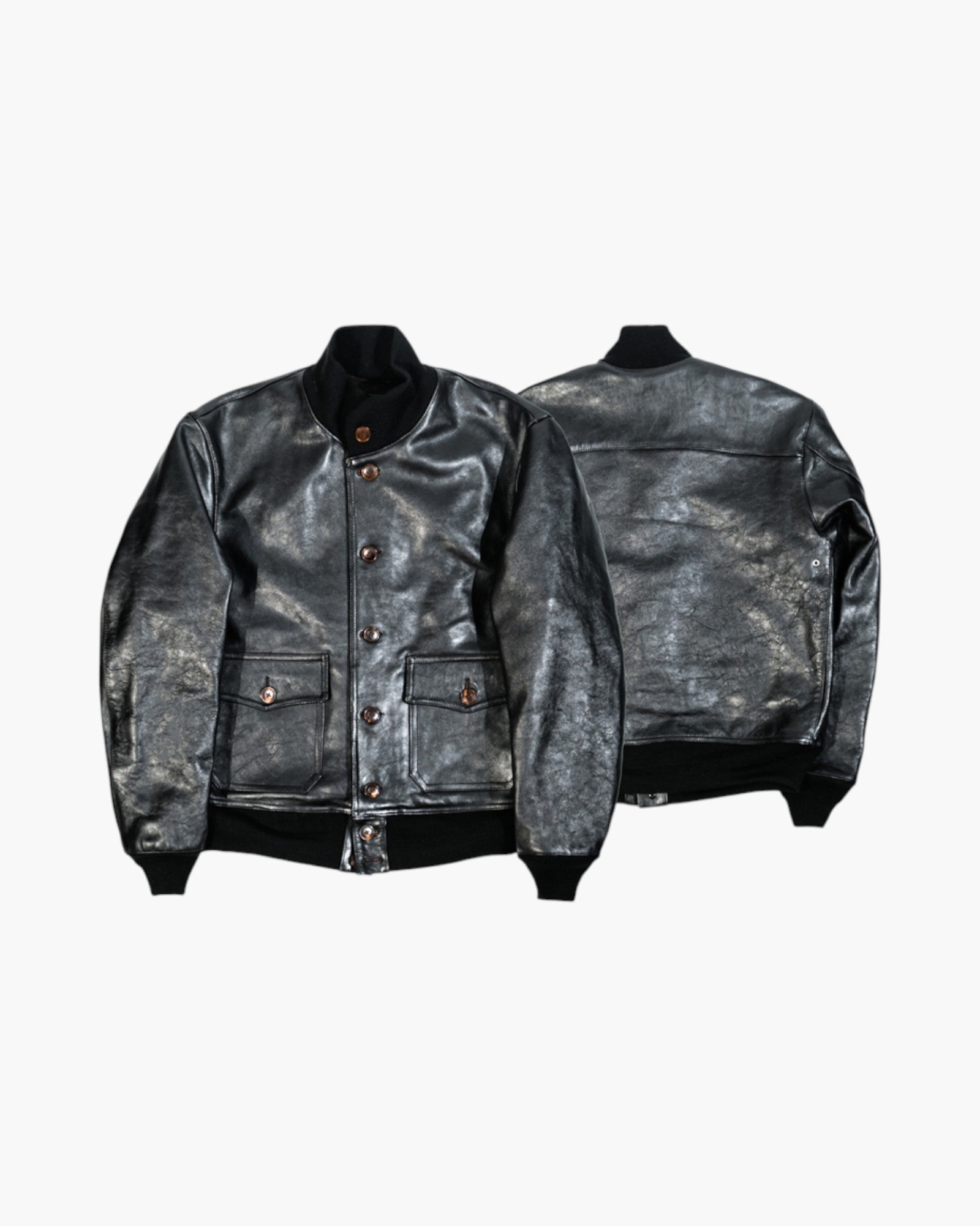 A faithful reinterpretation of the pioneering 1927 A-1 flight jacket, this piece carries the hallmarks of early aviation style—stand collar, horn buttons, patch pockets, and ribbed waistband—recast in untreated Padova tea-core horsehide. The slim fit is clean but not restrictive, while herringbone wool-blend lining and imported knit ribs balance comfort with durability. A heritage jacket built for both authenticity and daily wear.