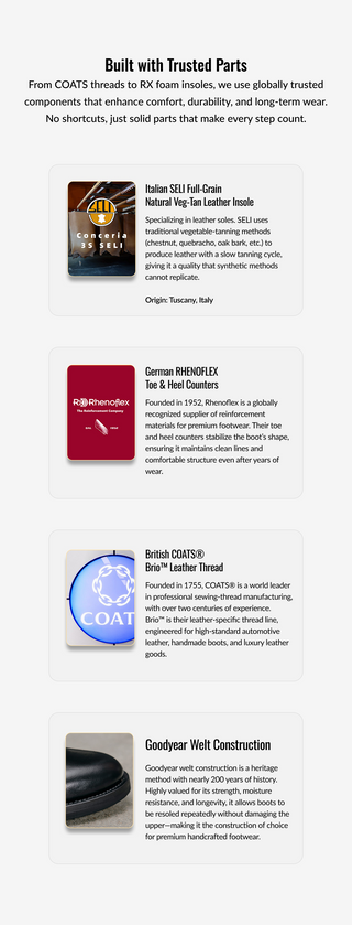 Our boots use Goodyear welt construction, known for its strength, water resistance, and easy resoling. This method lets you replace the sole without damaging the upper, making the boots truly long-lasting. Made to be worn hard, repaired easily, and kept for years — all at a price that stays fair.