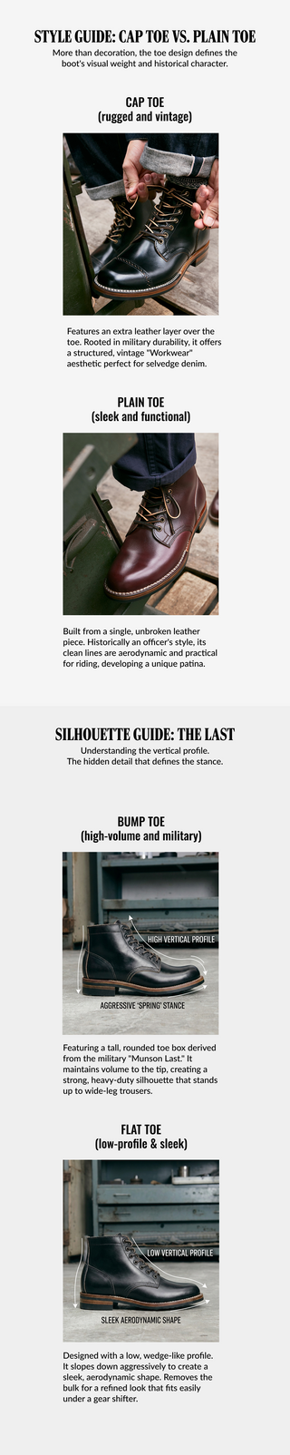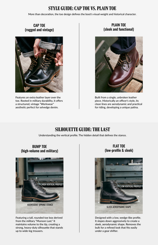 Inspired by the service boots worn by U.S. soldiers in WWI and WWII, the 8301 is the definitive military silhouette, combining a high-volume "Bump Toe" profile with a reinforced cap toe layer. Crafted from Taiwan TYCHE® waxed cowhide using antique machines and traditional stitch-down construction, it offers the most structured and aggressive stance in our lineup, providing a bold anchor for heavy workwear aesthetics.