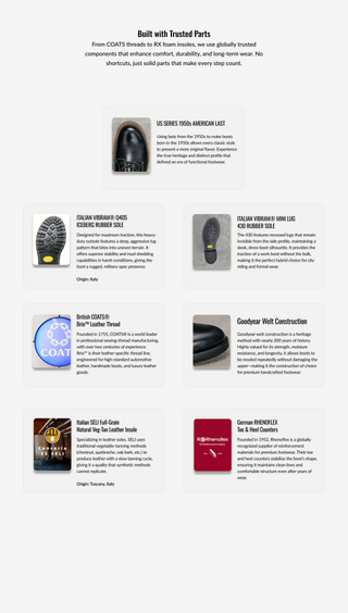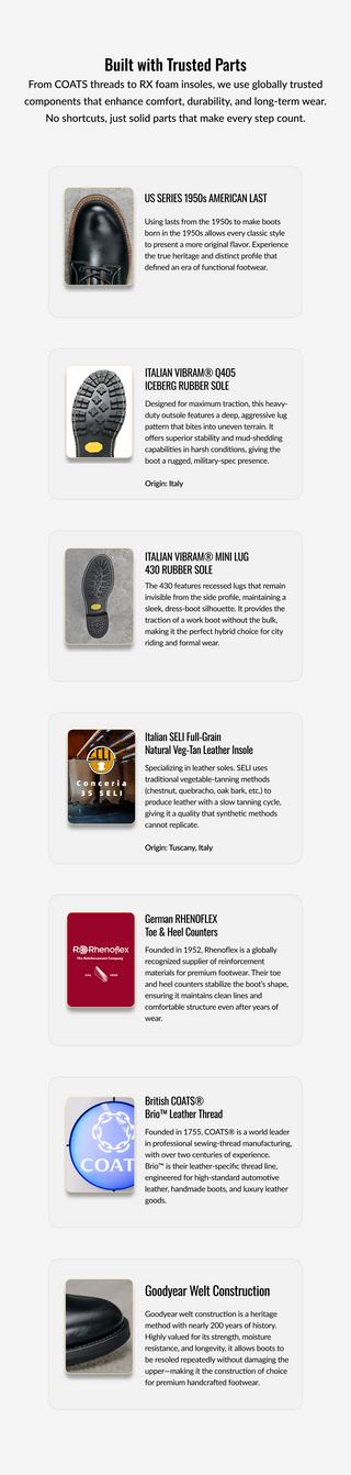 Our boots use Goodyear welt construction, known for its strength, water resistance, and easy resoling. This method lets you replace the sole without damaging the upper, making the boots truly long-lasting. Made to be worn hard, repaired easily, and kept for years — all at a price that stays fair.