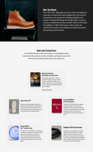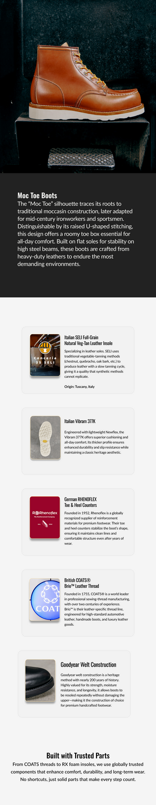Introducing our Moc Toe Boots, inspired by early American workwear and crafted from rich tea-core cowhide. Built with Goodyear welt construction and equipped with a Vibram® outsole and premium leather, these boots match with any vintage style, offer modern comfort, and long-lasting durability.