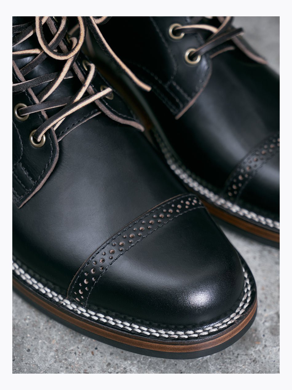 Inspired by the service boots worn by U.S. soldiers in WWI and WWII, the 3902 balances rugged heritage with a refined finish by building on a sleek "Flat Toe" profile with classic perforated cap toe detailing. Constructed from Taiwan TYCHE® waxed cowhide using traditional stitch-down techniques and grounded by an Italian Vibram ETON™ sole, this elegant shape offers authentic vintage character that transitions easily to smarter casual wear.