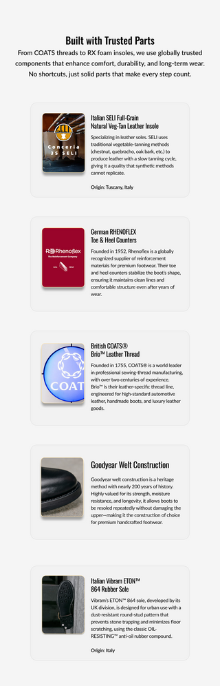 Our boots use Goodyear welt construction, known for its strength, water resistance, and easy resoling. This method lets you replace the sole without damaging the upper, making the boots truly long-lasting. Made to be worn hard, repaired easily, and kept for years — all at a price that stays fair.