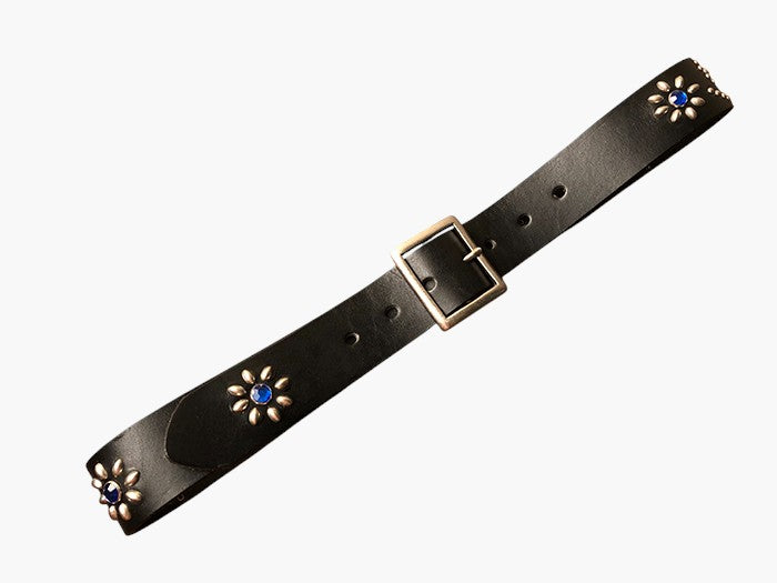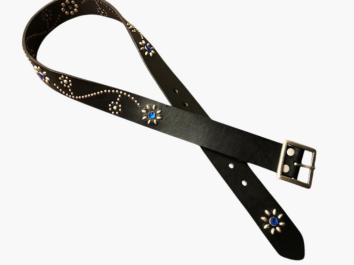 Inspired by the early Western belts born during the Gold Rush era, this piece carries the same spirit of individuality that defined the cowboys who first crafted them. Riders once set raw stones into their leather belts to mark their identity on the frontier. That tradition later evolved into metal studs and gemstone inlays—like the brass-and-red-stone motif seen here.
