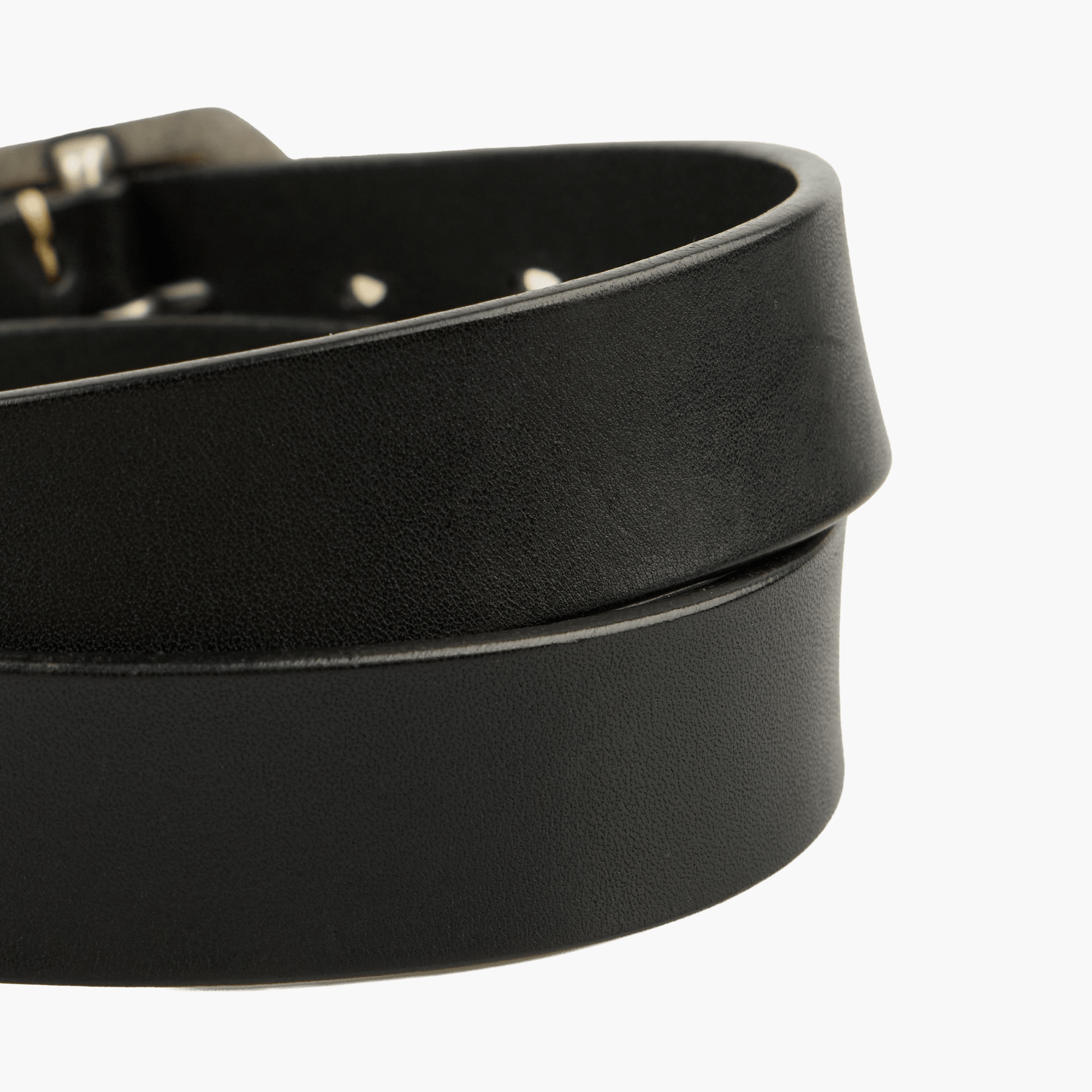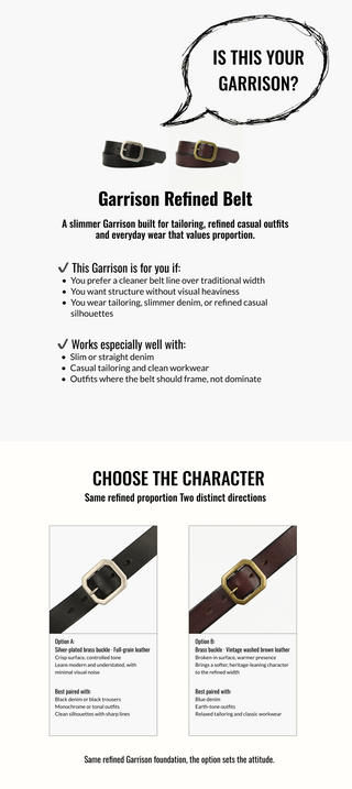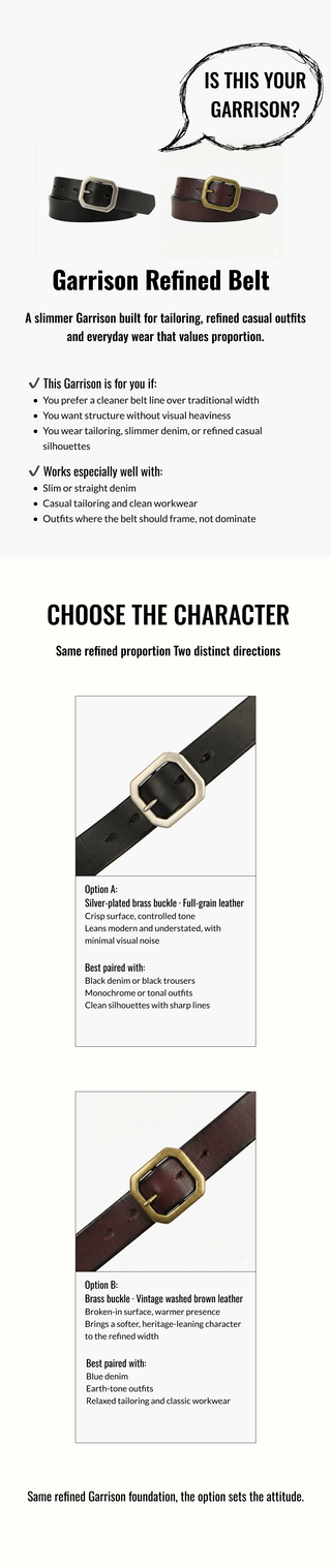 The Garrison Refined is the most considered and elevated expression in our garrison belt lineup. Made from vegetable-tanned, full-grain cowhide and finished with a clipped-corner flat buckle in solid brass, it departs from classic garrison proportions by adopting a slimmer 28 mm (1.1 inch) width. While traditional garrison belts sit closer to 35–38 mm, this refined profile creates a quieter, more balanced presence while retaining the attitude of a classic garrison belt. Designed to pair naturally with classic trousers, tailored denim, and softer silhouettes, it sits at the intersection of bold character and understated sophistication.