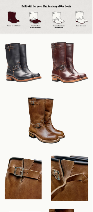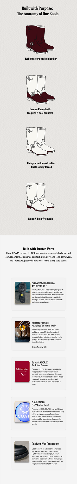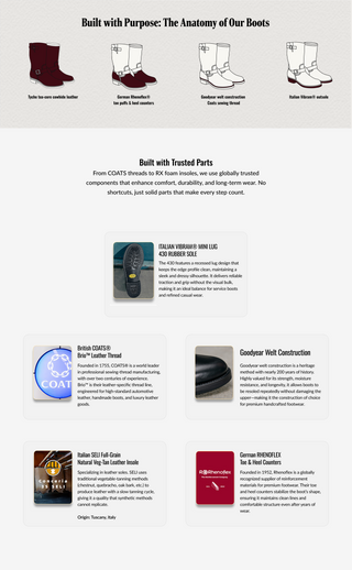 Our boots use Goodyear welt construction, known for its strength, water resistance, and easy resoling. This method lets you replace the sole without damaging the upper, making the boots truly long-lasting. Made to be worn hard, repaired easily, and kept for years — all at a price that stays fair.
