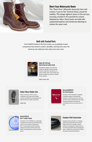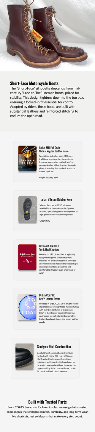 Our boots use Goodyear welt construction, known for its strength, water resistance, and easy resoling. This method lets you replace the sole without damaging the upper, making the boots truly long-lasting. Made to be worn hard, repaired easily, and kept for years — all at a price that stays fair.
