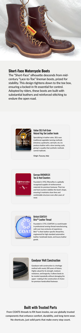 Boldly reimagining the spirit of vintage biker style, this two-tone short-toe motorcycle boots fuse the raw attitude of mid-century motorcycle culture with a modern silhouette. Crafted from premium nubuck and oil-waxed leather, and built with hand-stitched construction, these boots offer durability, presence, and a rugged charm that never fades.