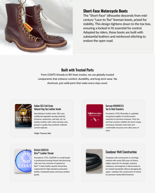 Our boots use Goodyear welt construction, known for its strength, water resistance, and easy resoling. This method lets you replace the sole without damaging the upper, making the boots truly long-lasting. Made to be worn hard, repaired easily, and kept for years — all at a price that stays fair.