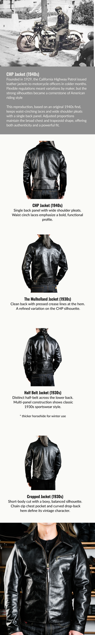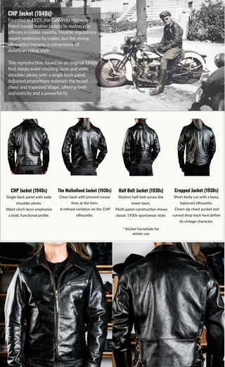 The California Highway Patrol (founded in 1929) motorcycle officers wear leather jackets in colder months. These jackets - later called CHP jackets - inspired many classic American motorcycle jackets.